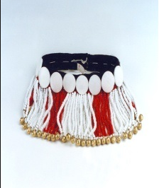 民族文化宫博物馆收藏的这件傈僳族缀彩珠女子“欧勒”帽,于上世纪70年代征集于云南省怒江地区。整个头饰直径16厘米、重534克,质地为琉璃质、铜质和海贝。帽身坠有24条红珠、38条白珠,珠体直径约0.5厘米,红白珠串相间分布,每组珠串下坠有金色铜铃,共29个,环绕整个帽身排列缝缀16个直径约3厘米左右的白色海贝片。整个“欧勒”帽色彩鲜艳,制作精美,佩戴起来衬托得傈僳族女子光鲜亮丽、风姿绰约。