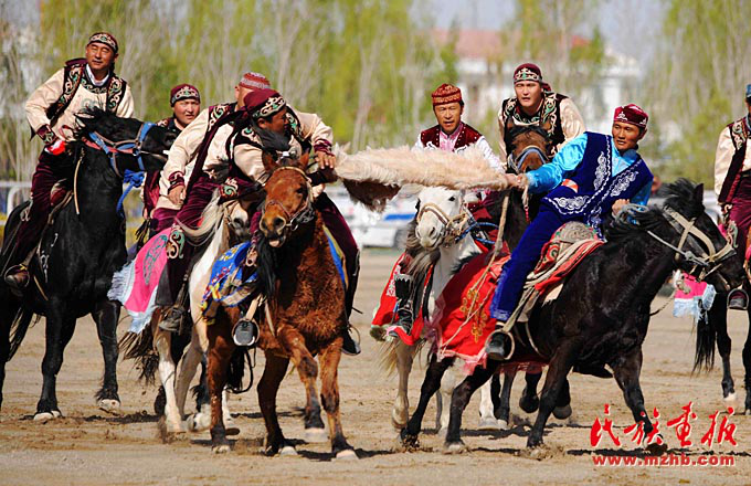 “叼羊”是哈萨克族一种力量和勇气较量的马背上的比赛。图为阿克塞县赛马会上的叼羊比赛