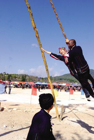 一位美国友人与爱尼姑娘共同体验“嘎汤帕”节的传统游戏“荡秋千”