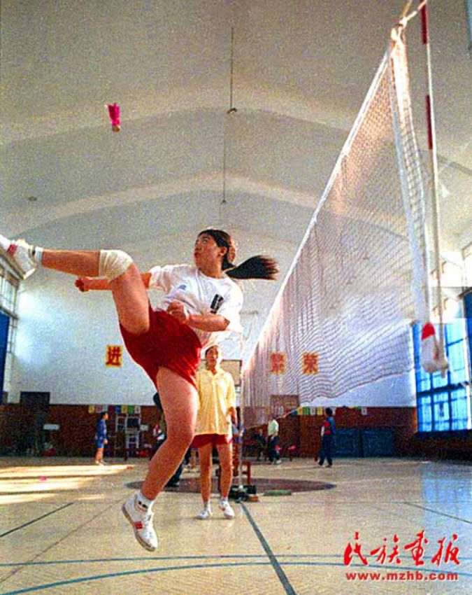 图为第七届全国少数民族传统体育运动会毽球(女子)比赛