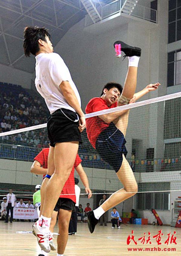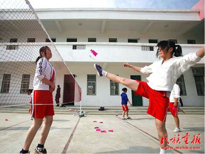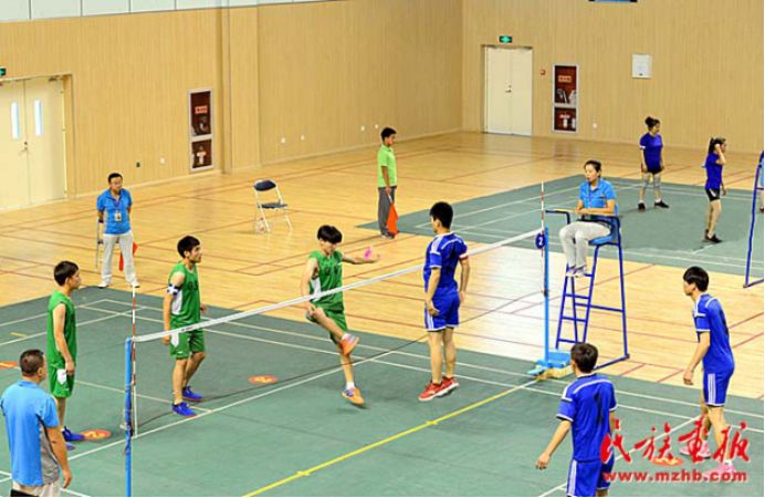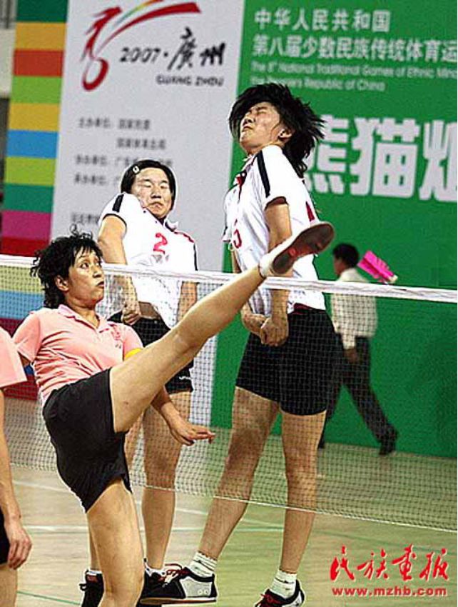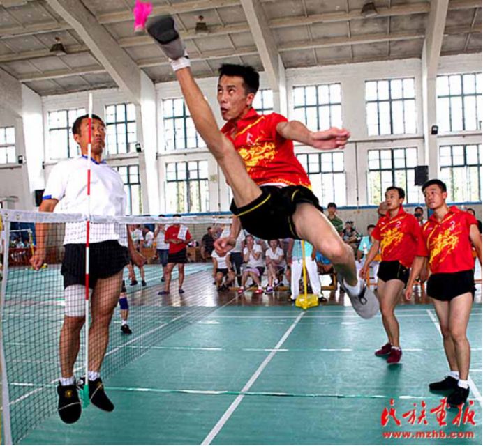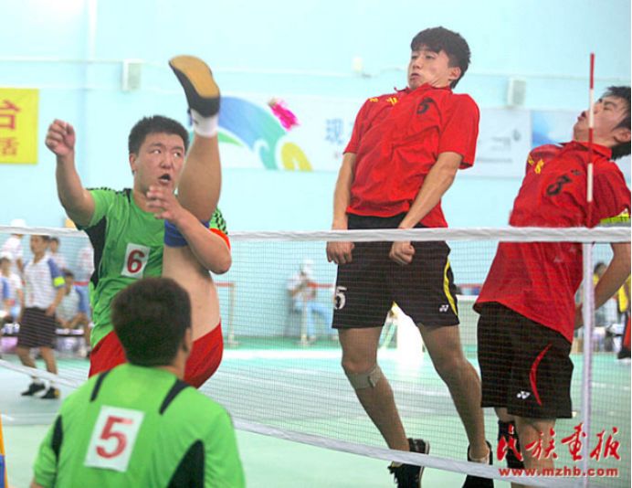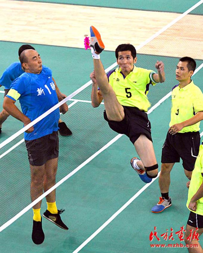 图为第八届全国少数民族传统体育运动会毽球(男子)比赛