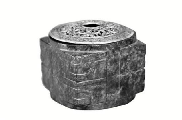 瞪着圆眼,头戴羽冠,八个神面纹分立于八个角。面前这个外方内圆、褐黄色的玉琮是典型的良渚文化产物,可又有些别致。琮孔内嵌圆桶形铜盒,带着一顶镂空西番莲纹盖。这是后人进行的大胆“改造”,仔细看,盖上还有一个圆孔,这造型像极了香熏炉。从祭祀到香薰,在升级进化后,玉琮被赋予了崭新的实用价值。可见,古人的脑洞也大得很,早就有开发文创产品的创新思维了。