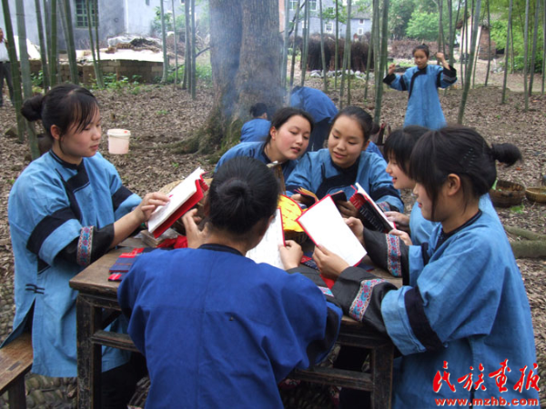 斗牛节时女青年在一起野餐并习女书(江永县委宣传部供稿)