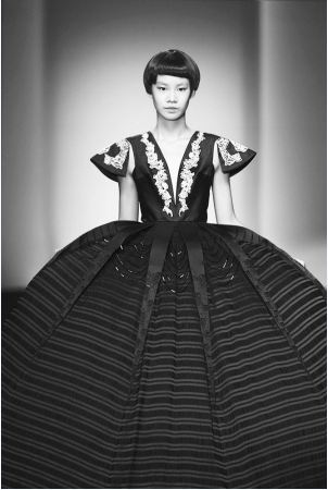当年,PACC携手公益保护组织“稀捍行动”共同发起了羌绣驻地计划(第二季),邀请跨界设计师参与羌绣创作。时尚设计师秦旭设计了一套黑色羌绣法式礼服,参加在巴黎举办的“向中国定制致敬”展览。礼服上半身用羌绣中的“素绣”针法,绣出秋海棠和石榴花的图案元素,象征珍惜、从容和多子多福之意;下半身则是浪漫宽大的法式蓬蓬裙。