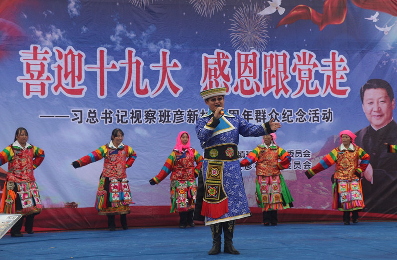 班彦村异地搬迁一周年之际,身着民族服装的村民与当地文艺工作者一起
