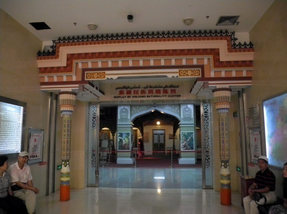 “新疆民族风情陈列”展现了新疆境内维吾尔、哈萨克、回、柯尔克孜、蒙古、锡伯、塔吉克、乌孜别克、达斡尔、满、塔塔尔、俄罗斯等12个少数民族绚丽多彩的民族风情。该陈列设计的最大特点就是将传统民族文化元素使用到极致,在有限的展示空间里,从各民族的住房、生活场景、民族形象、服饰特点、生活用品到各民族的宗教信仰及风俗习惯,都在陈列中得到应有的体现。观众进入展厅的同时,就会被新疆独具特色的民居风格和色彩绚烂的民族特色所吸引。展览为充分体现各民族自身特点,在每一个民族的展区里,都有其特色建筑并配以日常生活用品及生活场景,以真人大小的蜡像表现其民族形象及服饰特点,活灵活现的蜡像与较为逼真的生活场景搭配起来显得格外真实生动,给观众留下直观而深刻的记忆。展览内容详实,各民族的展品异常丰富:款式多样的男女服饰,做工精细,刺绣精美,工艺精湛;造型独特的民族乐器,种类繁多,大小各异,奇妙无比;琳琅满目的生活用品,从古到今,分门别类,一应俱全。“新疆民族风情陈列”展览面积虽不大,但却较好地利用了有效的空间并结合了现代展示手段,充分体现了少数民族文化元素,突出了各民族自身的特点,使陈列更为合理,达到特殊的艺术展示效果,让观众得到了视觉和美学上的享受。观众通过观看展览,可以在短时间内充分领略各个少数民族的民族特点及民族风情。这种贴近生活,贴近观众,而又极富民族文化元素的陈列形式正是观众所喜闻乐见而又易于接受的,它为观众打开一扇了解新疆,了解新疆各族人民的五彩窗口,让中华民族文化宝库中绮丽的瑰宝再放异彩。