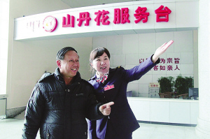 乌兰浩特火车站山丹花爱心服务队成员斯琴高娃(右)为旅客做引导服务。徐月摄