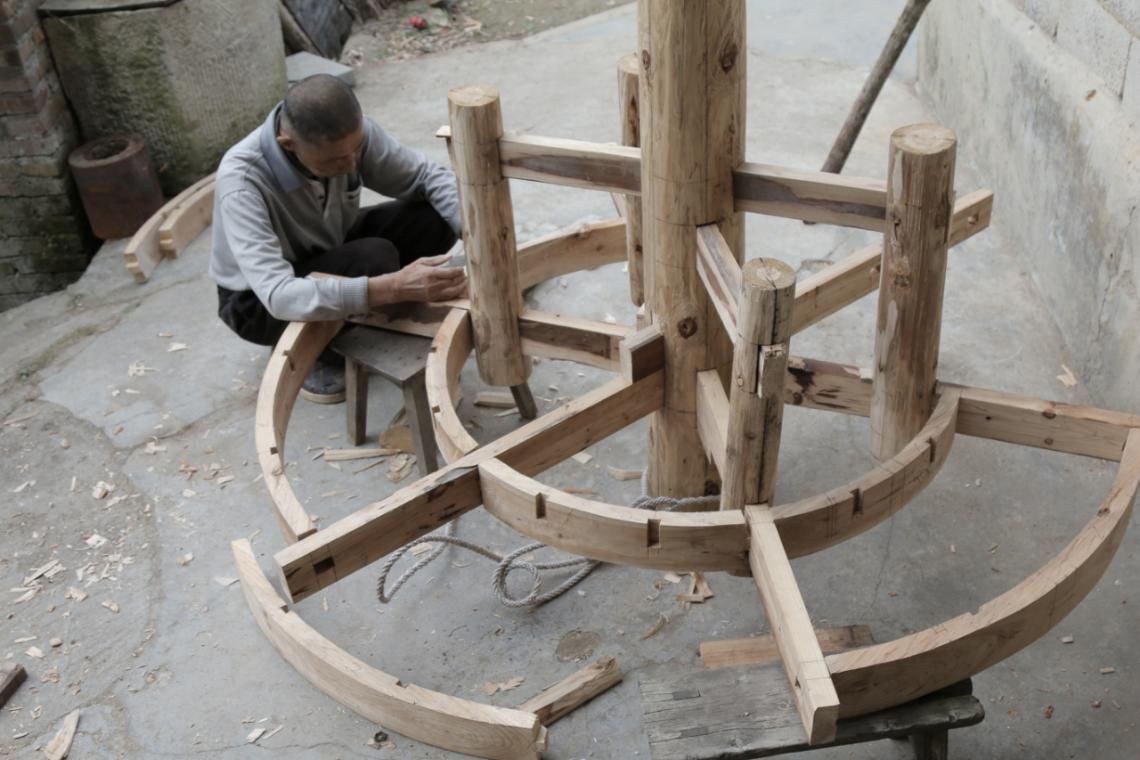 首先,需要一根笔直结实的树干作为将军柱的材料;其次,找一块略弯的木料用来制作弯板,适合做弯板的材料相对比较难找,需要经常上山寻觅;然后找几根中等粗细而笔直的树木作大方,把原材料用斧头修整好,锯掉多余部分,用刨子把木料表面刨光滑,用墨斗在材料上画出需要锯除或者打洞的地方,画出细节和尺寸。方便制作将军木、弯板和大方。然后根据画出的尺寸,用凿子在将军木上转孔,修整大方及弯板。最后将其进行从内到外的组装。