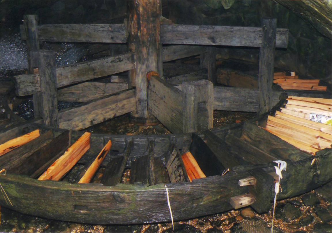 卧轮式水伞,由水柱、水杆、推叉、赶杆、石圆盘、水依板组成,所用的木质选择耐磨的枫香树。它利用水依板的作用,使这种水车能在平坦的水流中,通过水的动力来带动石碾转动,从而减轻了人们在生产生活中繁重的劳动力。如今在香纸沟一带还保存着这一古老民间手工技艺。卧轮式水车的制作是一门独特的手工技艺,会制作的人很少。水依板的大小会直接影响水车的功效,必须按照传下来的尺寸制作。水车的直径2米、由6方木组成,通过水流的冲灌才能使水伞转动。
