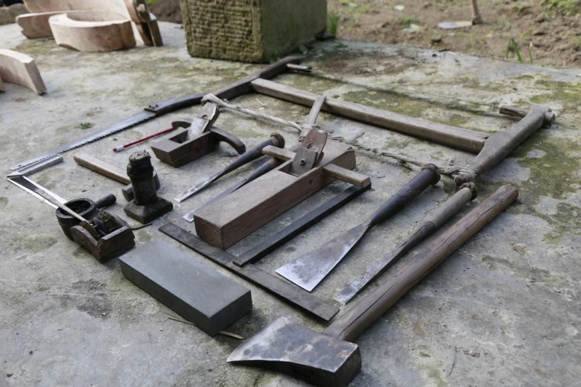 罗术玉,男,73岁。卧轮式水伞市级代表性传承人。他告诉我们,他们的祖辈是源自江西,后辗转迁到这个地方的。他们家族世代是木匠出生,靠斧头、锯子手艺生活。这里家家户户都造纸,村民们也世代以造纸为生,自然制作、维修水伞的活就做的比较多。加上他家的手艺好些,制作出来的水伞转的滑唰,找他家制伞和维修的也就多些。他从小就看他的父亲制作,从小看父辈们做活。小时候就拿斧头、锯子、刨子当玩具。16岁就跟父亲学习制伞,20岁就全部掌握了卧轮式水车的制作技艺。水伞的制作都是直接去买主家,按照买主的要求来制作水伞大小,材料也是直接在买主家山林里寻找。