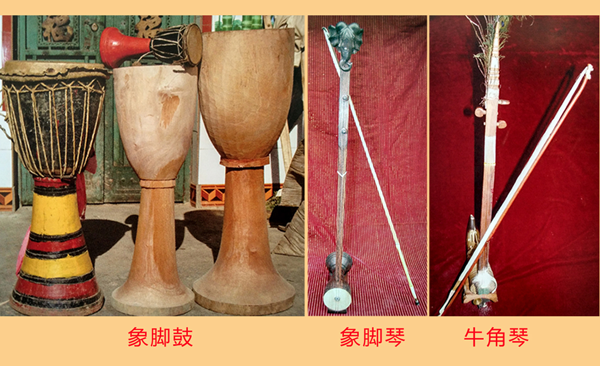 傣剧是在傣族民间歌曲和歌舞音乐的基础上发展起来的,并借鉴了汉族戏曲艺术的表现手段,流传于德宏、保山、临沧等傣族聚居区。傣剧包括多种男女唱腔,男腔多用羽调式,女腔多用徵调式。20世纪50年代以来,傣剧吸收了多种傣族民歌和舞曲,丰富了唱腔,增强了音乐的表现力。傣剧唱腔基本是上下句组成的乐段及其变化反复。由于唱词字数可多可少,因此唱腔乐句长短不一。过去,傣剧只用小堂鼓、锣、镲等伴奏,后逐步采用了多种民族乐器及西洋管弦乐器,组成新型的傣剧乐队。傣族的民族乐器属于吹奏乐器的有筚、葫芦箫(如图)、竖笛、木叶等;弹拨乐器有玎琴、口弦等;弓弦乐器有西玎(玎琴)、牛角玎(牛角琴)等;打击乐器有象脚鼓、光隆、光边、光邦、锣、镲等。象脚鼓、锣、镲的合奏是傣族器乐合奏的主要形式。