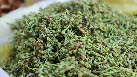 在镇沅恩乐农民街市场,随处可见当下时令野花野菜,有黄的、绿的、白的,可谓是春花大比拼,仿佛把整个春天的颜色都搬上了街头。其中最引人注目的是用桶或盆盛装的棠梨花,本地人吃棠梨花的时间通常为每年2月至4月。