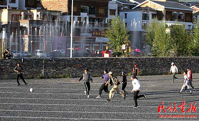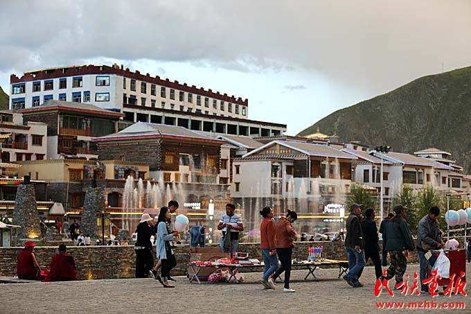 灾后重建让玉树大踏步前进,人们悠闲地走在广场上享受着基础设施改善带来的各种便利