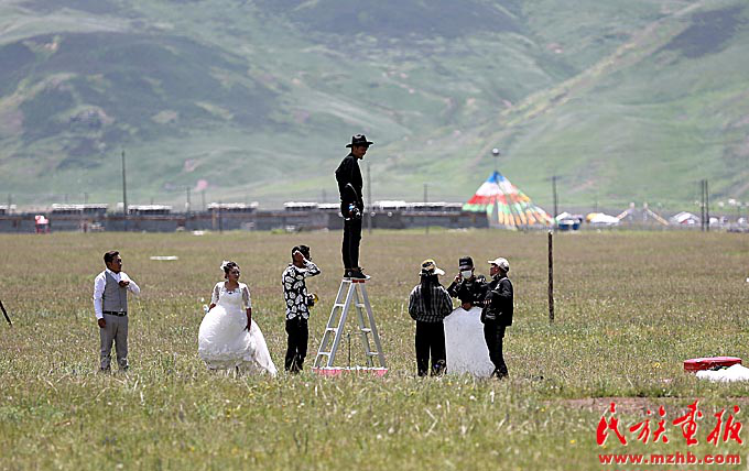 巴塘草原上,藏族情侣正在拍摄婚纱照