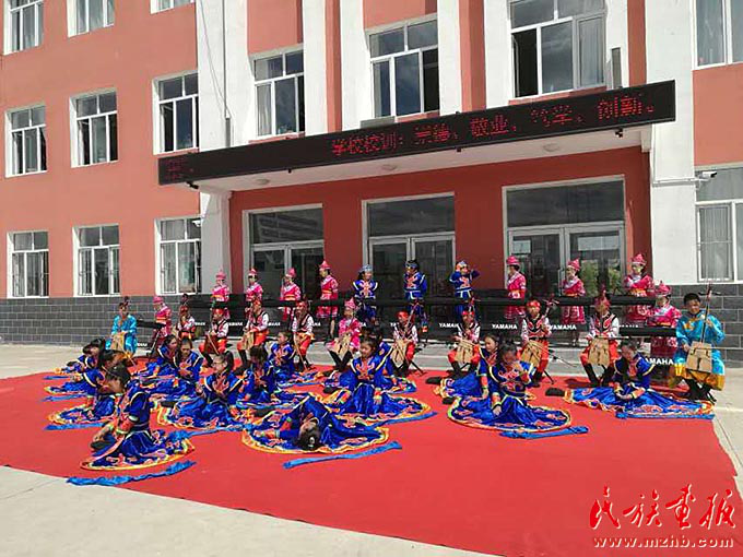 农牧民的孩子们在家门口的小学里也能接受到专业系统的艺术教育,图为孩子们在进行才艺表演