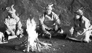 身着鄂伦春族传统服装的孟松林(中),在篝火边讲故事。孟松林供图