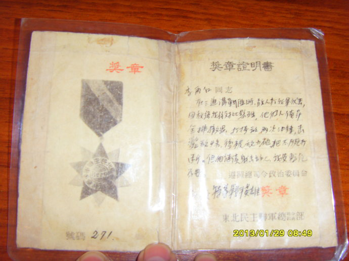 一九四五年十月六日,李炳仁在龙源村参加东北民主联军,所属部队是六团三营九连,当过排长和代理连长。他参加过桦甸夹皮沟消灭国民党土匪战斗,三道满剿匪战斗,四平二次攻城战役等。在一次战斗中,李炳仁担任尖刀排排长,英勇战斗,冲在部队进攻的最前面,为部队取得这次的战斗的胜利起到关键作用。战斗中,他被敌人的炮弹击中,失去了左胳膊,眼睛也受伤。当时,“吉东报”上刊登父亲的照片并介绍了英雄事迹,部队简报也刊登了英雄事迹。