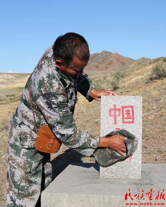 马合沙提 ·斯拉木精心维护界碑(赵利 摄影)